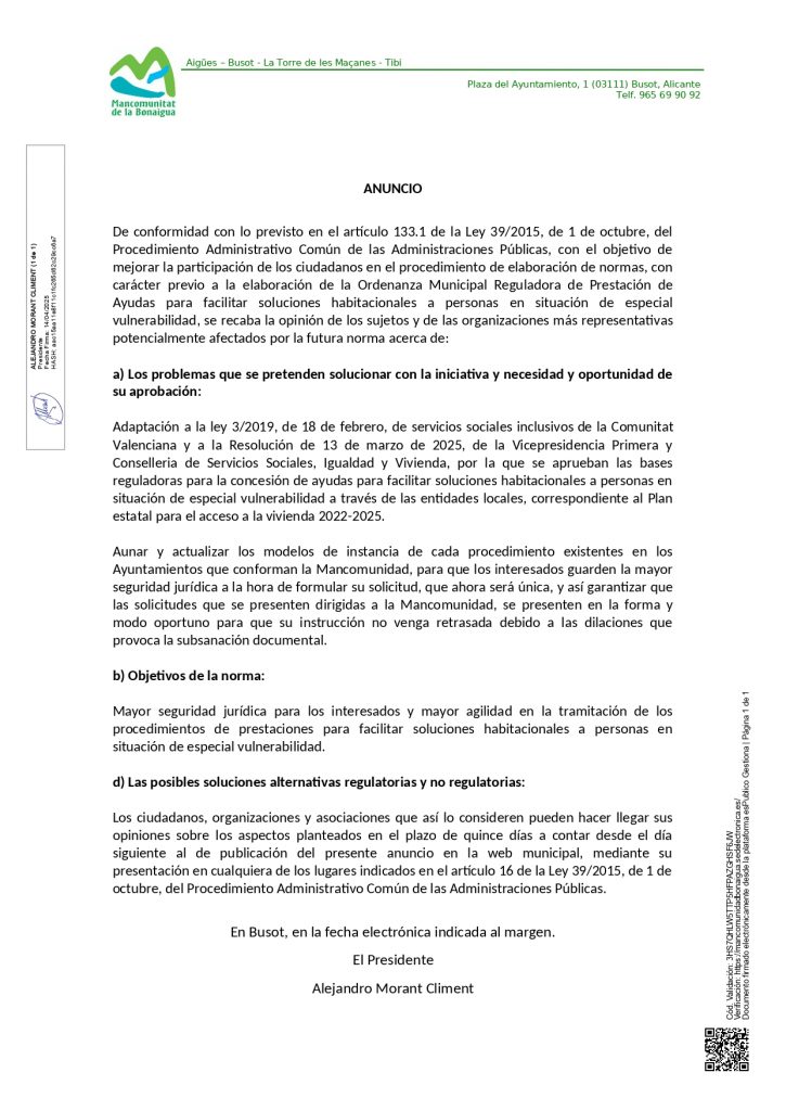 Anuncio consulta pública Ordenanza Municipal Reguladora de Prestación de Ayudas para facilitar soluciones habitacionales a personas en situación de especial vulnerabilidad